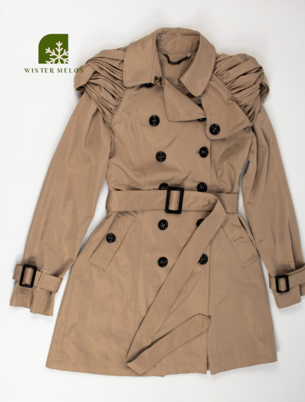 ปิดท้ายด้วยเสื้อเทรนซ์ BURBERRY สีกากีเข้ม โดนใจใครหลายคนแน่นอน เสื้อที่มีความวินเทจ กระดุมสองฝั่ง ข้างละ 5 เม็ด กระดุมกระเป๋าอีก 2 เม็ด มาพร้อมเข็มขัดผ้า แขนเสื้อยาวสามารถปรับกระชับตรงบริเวณแขนเสื้อได้ ใส่เที่ยวเมืองหนาวได้สบายเพราะเสื้อเทรนซ์ตัวนี้ให้ความอบอุ่นได้ดี